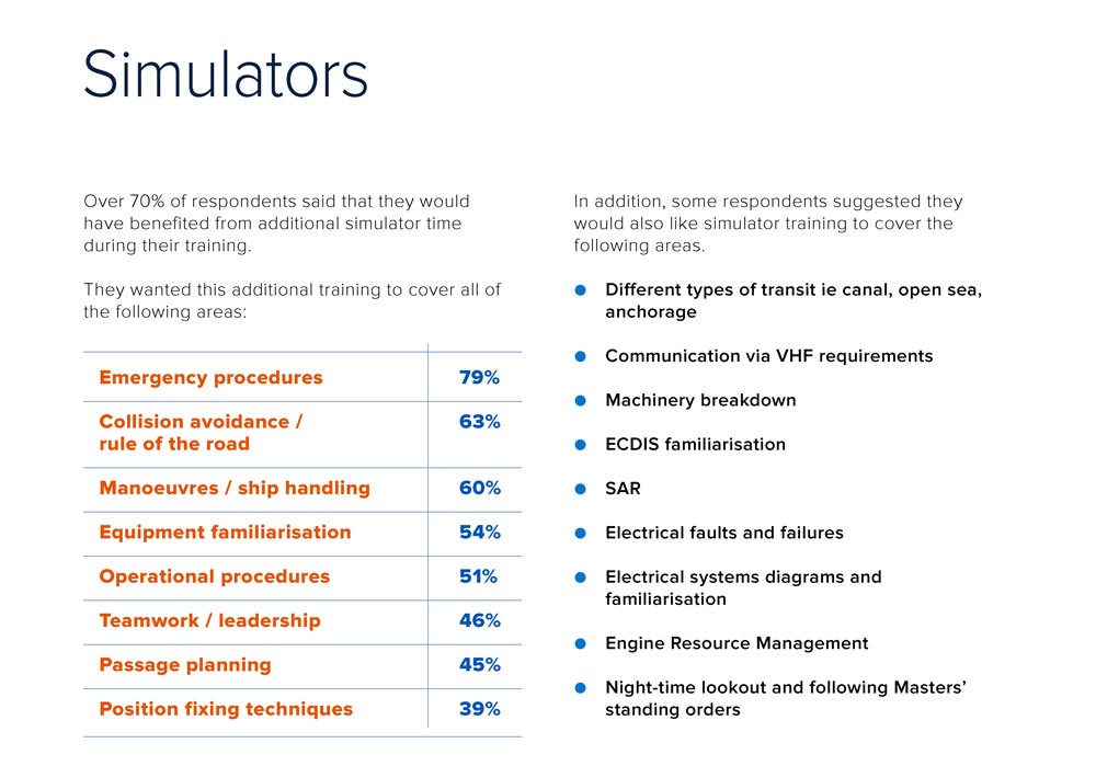 - Increased simulator training. Over 70% of respondents were in favour of additional simulator time and pointed to emergency procedures and complex collision avoidance as scenarios that should be covered. It is worth noting that controversy around simulator training relates to the reduction of sea time, not the use of simulators per se